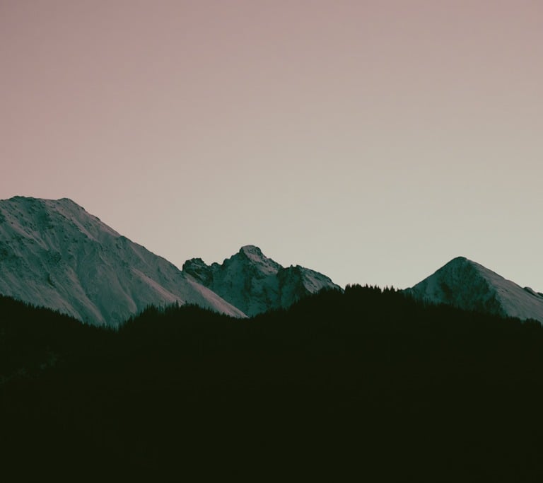 A moody, landscape where a towering, snowy mountain ridge meets a sharply defined treeline. The eye is drawn to the prominent, craggy peak in the center, which appears to be carved into the shape of a face gazing skyward. The muted color palette of dark greens, cool grays, and the soft mauve sky enhances the sense of silent, ancient watchfulness.